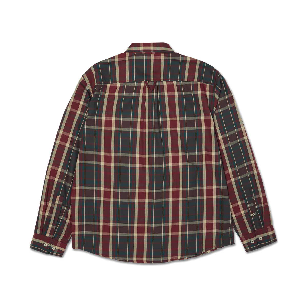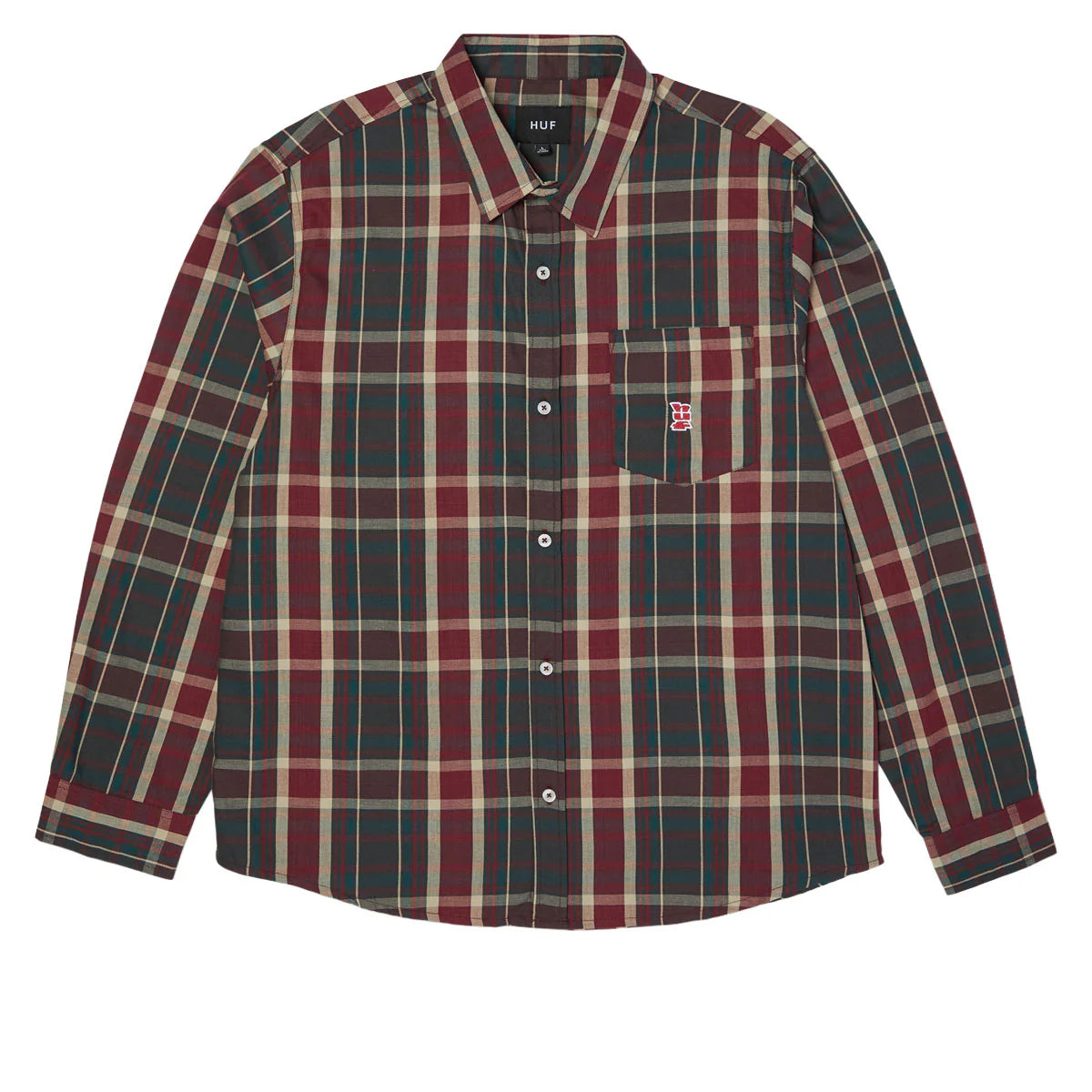 The Megablast Plaid L/S Shirt is a cotton poplin long sleeve yard-dyed plaid shirt with patch pocket, embroidered artwork, and button down front.