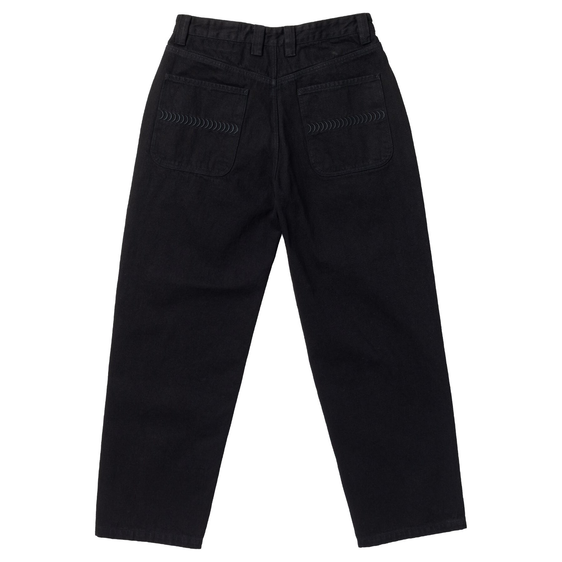 Denim pants with custom embroidery on the rear pockets and an embroidered graphic in the front right pocket.